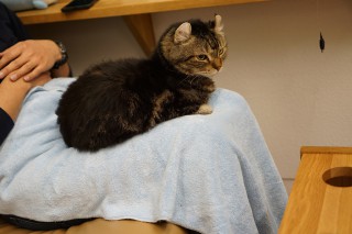 ふだんは座椅子のお客様のお膝に乗るカールス。
