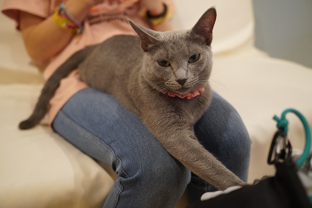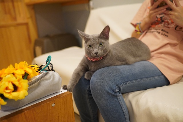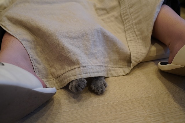 お客様の足間に入るローズちゃん