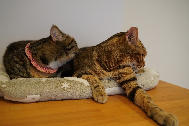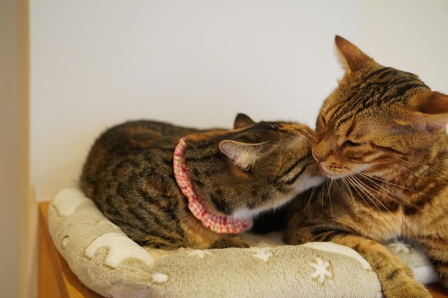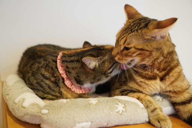 ぺろぺろと舐めながら、「ちょっと狭くなったから向こうへ行って~」