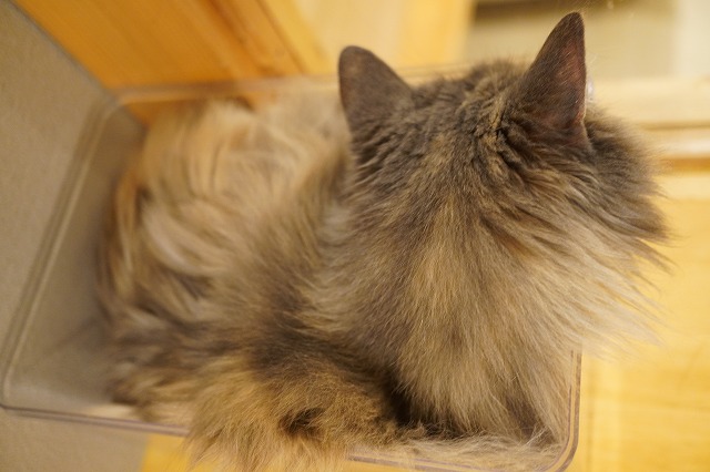 棚上で寝ている金時くんを見つめるこむぎちゃん