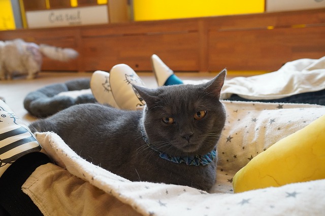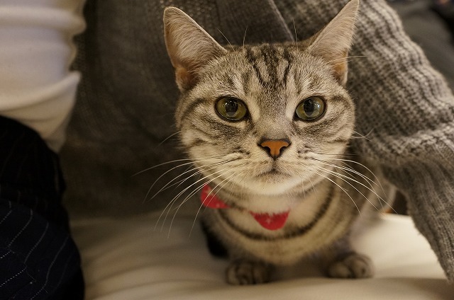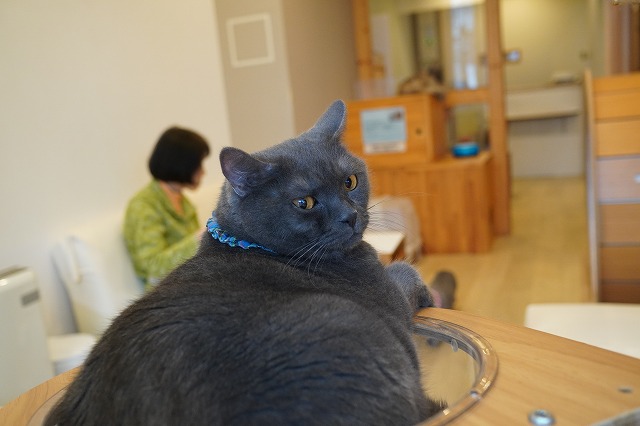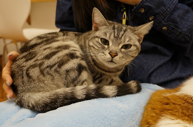 お客様のおひざに乗ってます