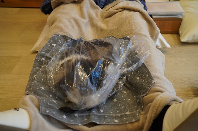 おひざにビニール袋を乗せると入っていったボンボンちゃん
