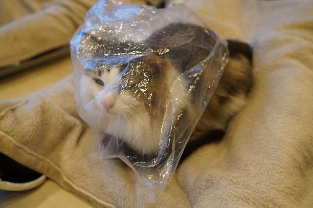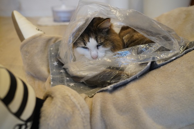 昔は普通におひざ乗りしたのでビニール袋で本来の人懐っこさを発揮したボンボンちゃん
