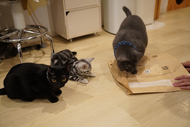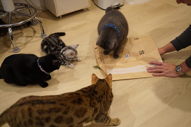 紙袋から出てくる獲物をみんなと一緒に見つめます