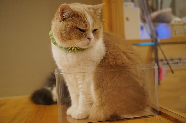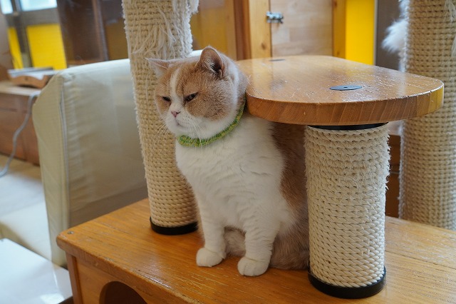 いつものカウンターで寝床を空くのを待っているコロン君。