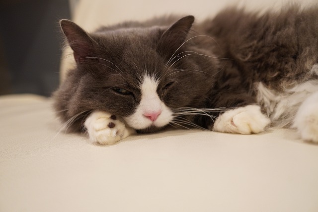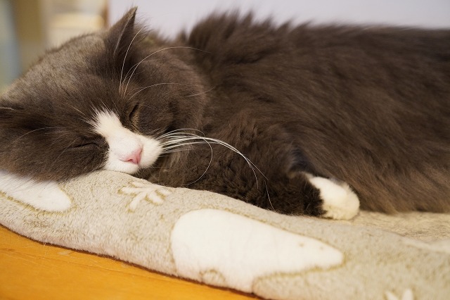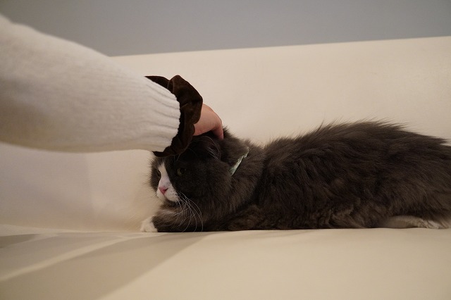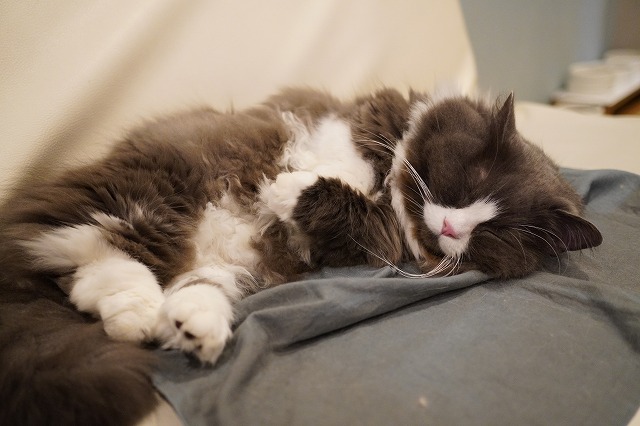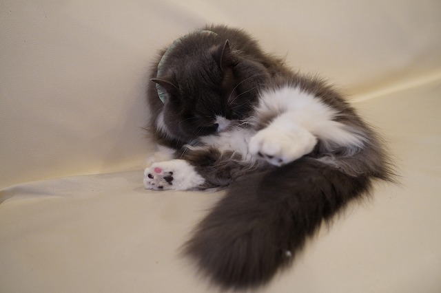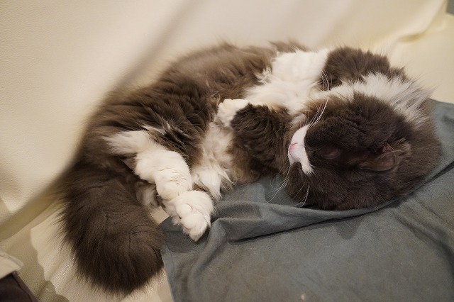 1時間後、別のお客様のおひざで寝るラムネくん。