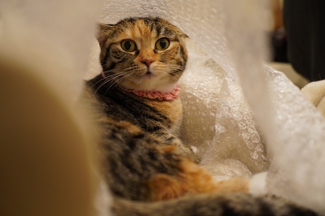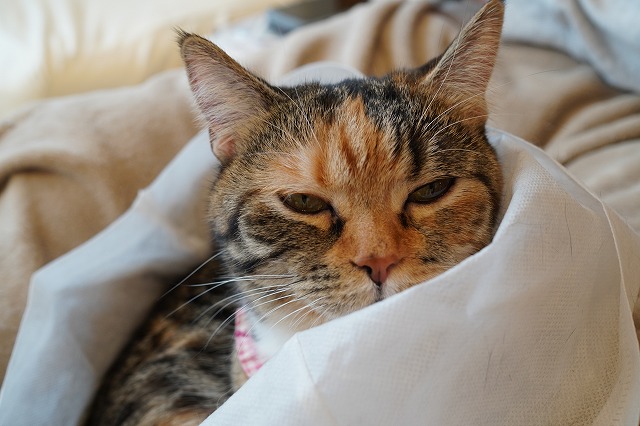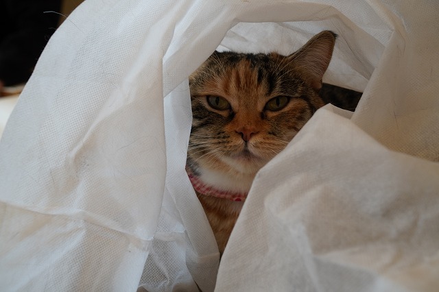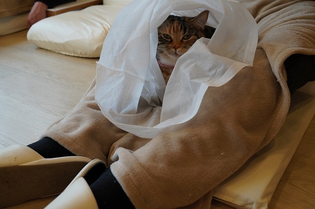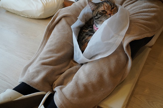 袋から顔を出しても大人しくおひざ乗りするあられちゃん。