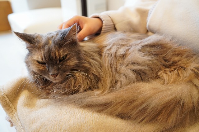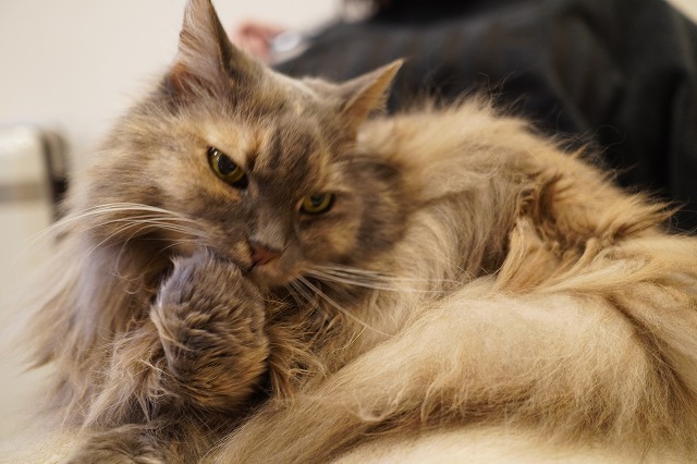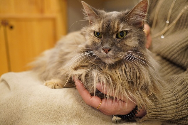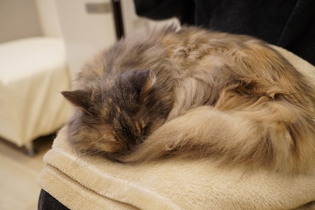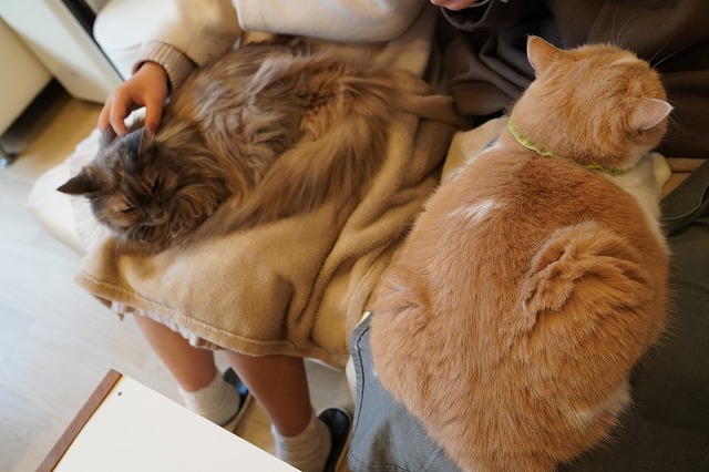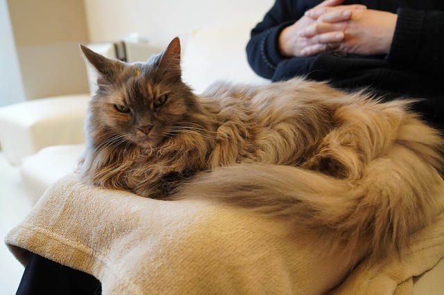 しっかりお客様のおひざをキープするこむぎちゃん。