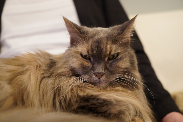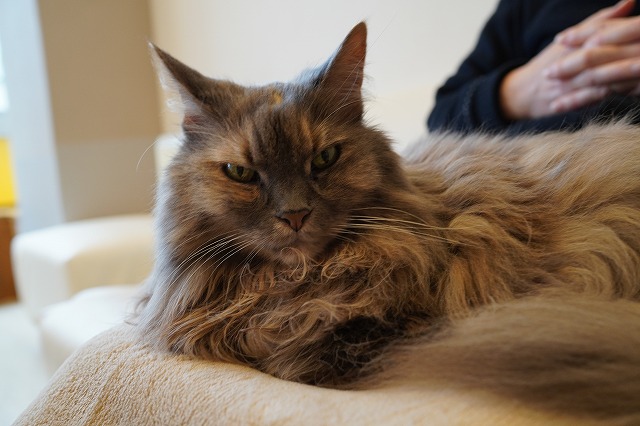 すぐに落ち着かずにおひざの上で考える珍しいこむぎちゃん。