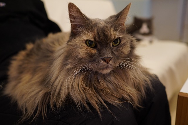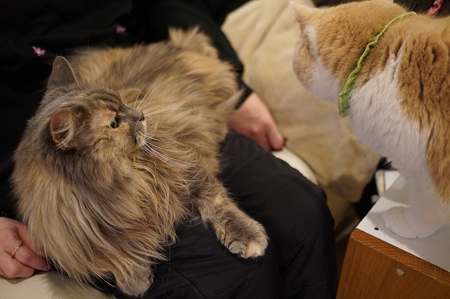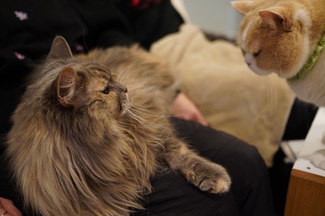 ジャスミンちゃんを押しのけて奪ったおひざをコロン君が狙っていました。