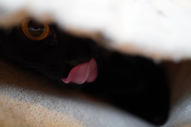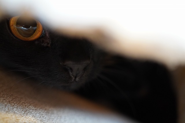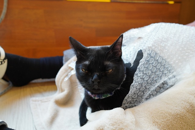 お客様のおひざの上のマットに入り込むうにくん。大きなお目目。