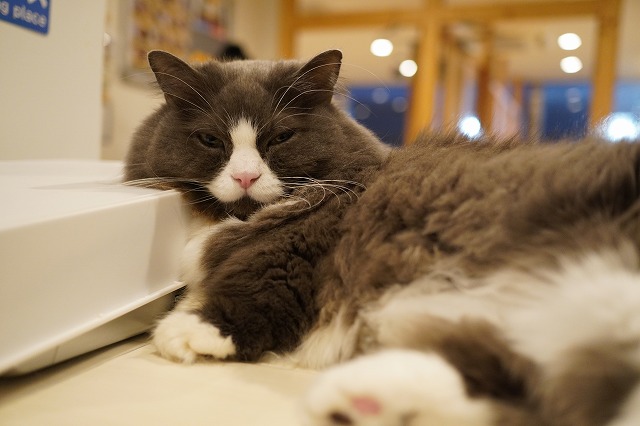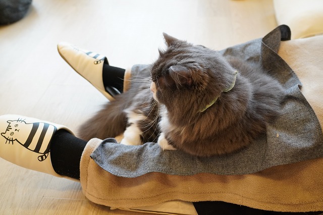 お客様のおひざの温もりを楽しむラムネくん。