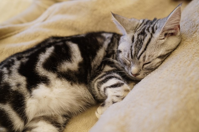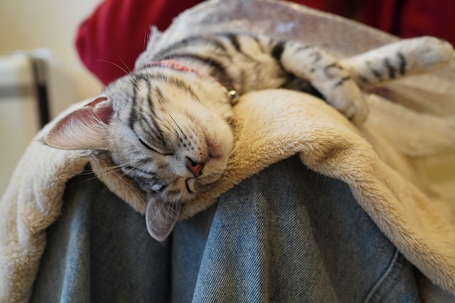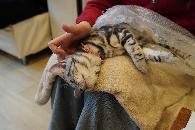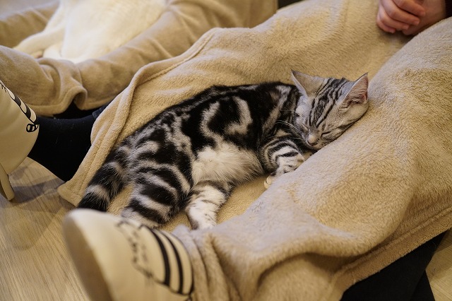 眠たい時はお客様のおひざでまったり。