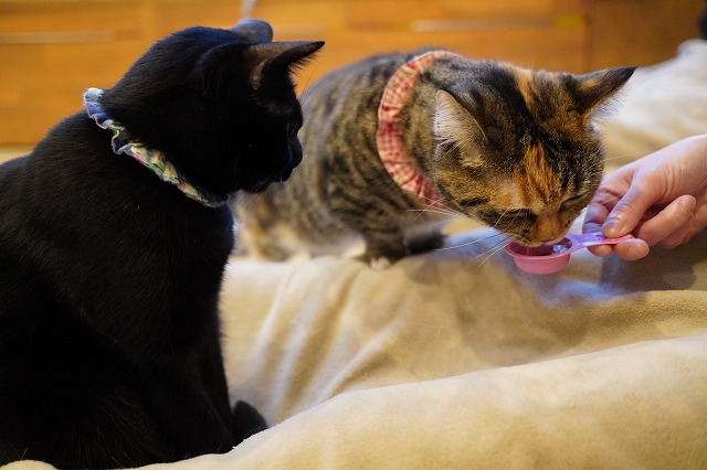 おひざ乗りのうにくんの前でおやつを頂くあられちゃん。