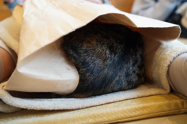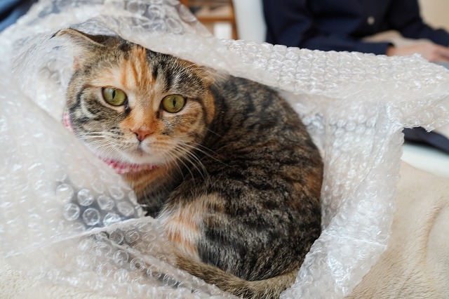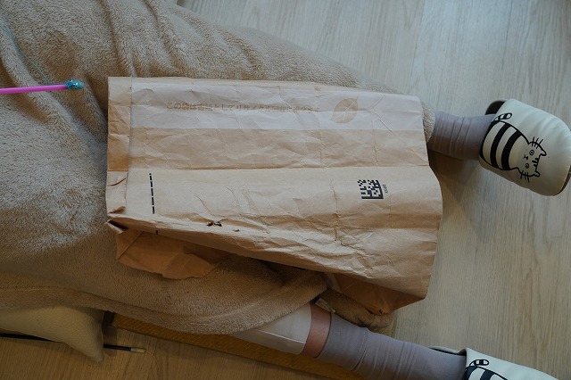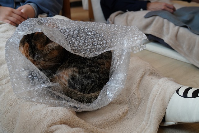 お客様のおひざの上にあるぷちぷち袋に入っていったあられちゃん。