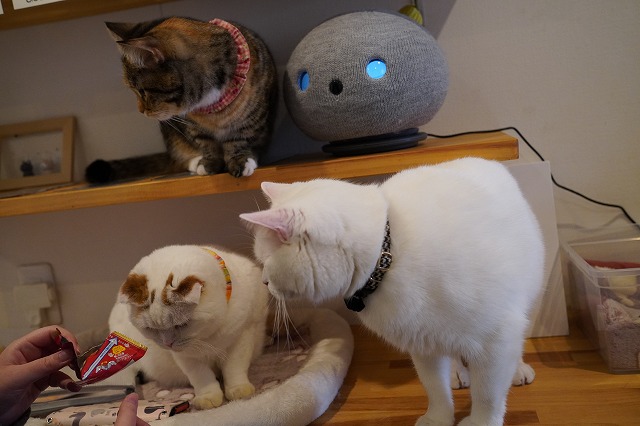座椅子ルームにお客様をみつけ、おやつをもらいに行きます。