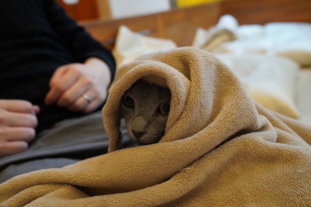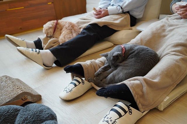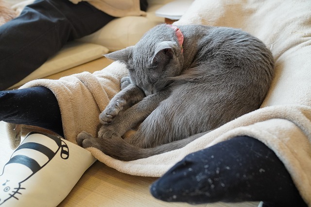 お客様のおひざで眠るローズちゃん。