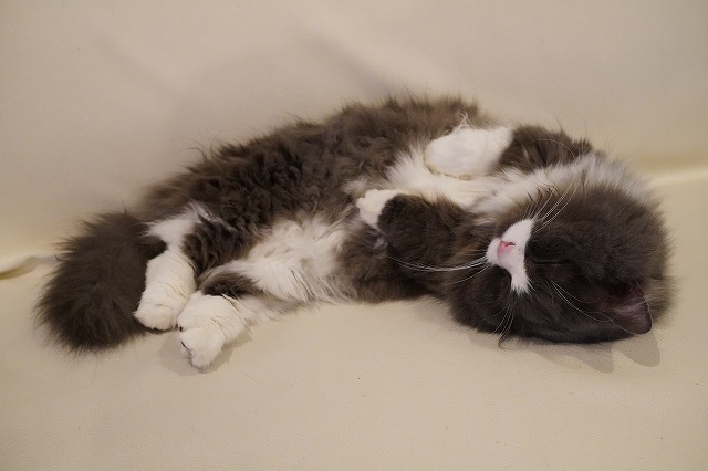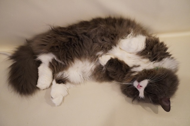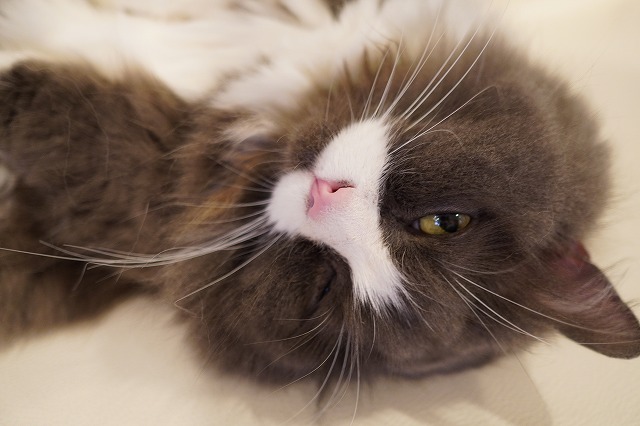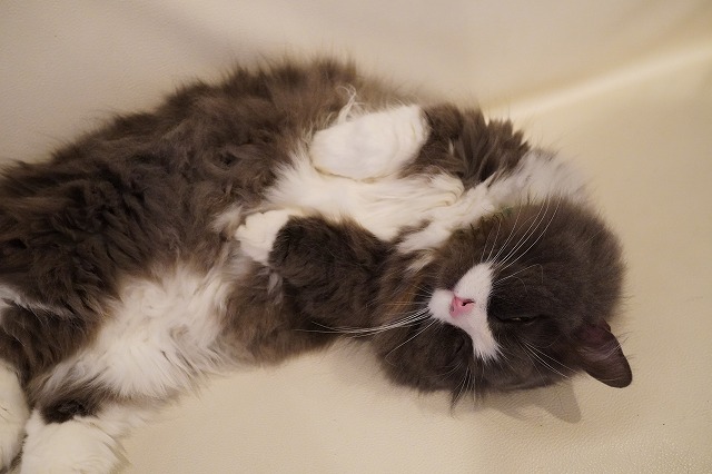 カメラを見つけて転がり仰向けで寝そべるラムネくん。