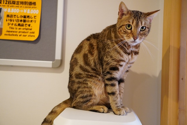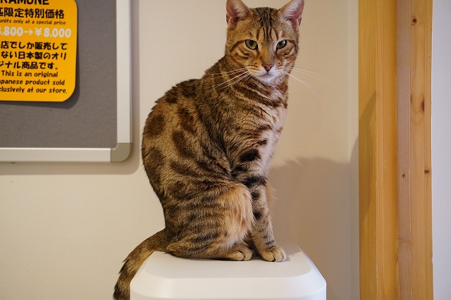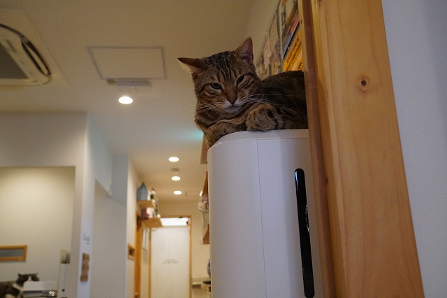 再びウォーターサーバー上で立って撮影している私の顔を見る金時くん。