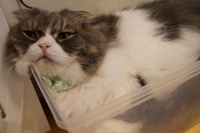 その後、箱猫になってまったりするミントくんでした。