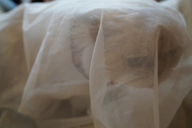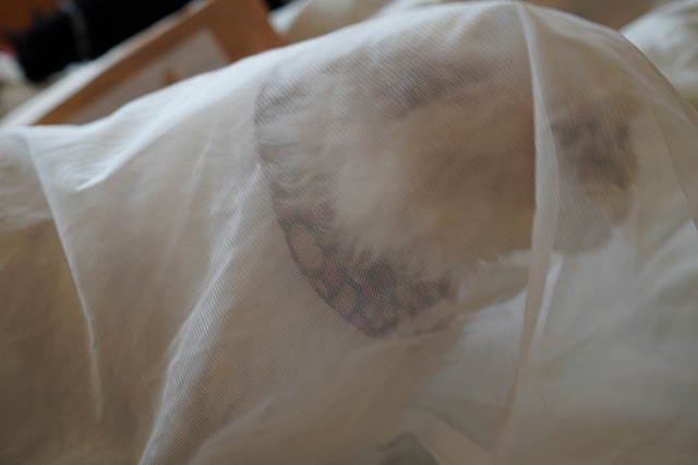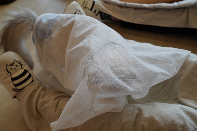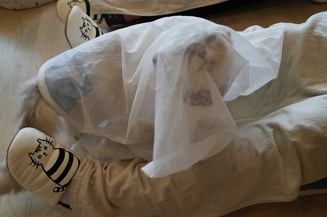 お客様のおひざ上の洗濯ネットに入っていくしずくちゃん。