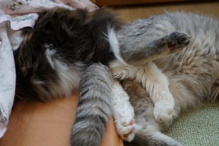 お客様の足の間に潜っていたプリンちゃんの足がつくしちゃんにからまっていました。